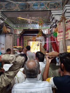 हमने पास ही की एक दुकान से प्रसाद लिया और पहुंच गए श्रीजी के दर्शन को। सम्मोहित सी करती है भगवान की छवि। अपूर्व शांति का एहसास होता है। यहां श्रीजी भगवान विष्णु के रूप में विराजमान हैं और अपने कल्याणकारी भाव से कल्याण धणी के रूप में लोक आस्था में रचे बसे हैं। लोक आस्था यही है कि भगवान सभी का कल्याण करते हैं। लोग मनौती मानते हैं और पूर्ण होने पर भगवान के दर्शन-पूजन को पहुंचते हैं। ध्वजा चढ़ाते हैं। श्रद्धालु ध्वजा लेकर नाचते गाते हुए मंदिर तक आते हैं। मांगलिक लोक गीतों की जगह अब डीजे की तेज धुन में बजते गीतों ने ले ली हैं। जय श्री जी जय कल्याण के जयकारों के बीच लोग ध्वजा लेकर मंदिर पहुंचते है और भगवान को अर्पित करते हैं। श्रद्धालु कई किलोमीटर की दूरी नंगे पांव तय कर श्रीजी के दर्शन को आते हैं। स्थानीय लोग मंदिर काफी प्राचीन 5600 साल से लेकर 500-600 साल पुराना बताते हैं। मंदिर को लेकर कई पौराणिक आख्यान जुड़े हैं।