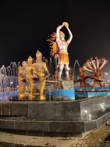 निवास के लिए कोई परेशानी नहीं हुई क्योंकि #श्रीमहाकालेश्वर भक्त निवास में बुकिंग थी, वहीं प्रांगण में #भारतमाता मंदिर है, जहां प्रतिदिन शाम 8 बजे #वंदेमातरम् गायन के साथ आरती होती है, जिसे देख देश से जुड़ाव का अहसास होता है, बच्चों को ऐसी जगह से अवश्य रूबरू करवाना चाहिए, जिस #संस्कृति संक्रमण के दौर से आज की पीढ़ी गुजर रही है, उसके लिए अति आवश्यक, जानकारी के लिए बहुत अच्छा है। महाकाल लोक कॉरिडोर कला और आध्यात्म का अद्भुत संगम है। हम सायं आठ बजे तक फ्रैश हो चुके थे, भक्त निवास और कॉरिडोर की दीवार एक ही थी हमारे कमरे की खिड़की से ही कॉरिडोर का नजारा लाईटिंग, भीड़भाड़ दिख रहा था। जल्द ही हम भी कॉरिडोर के लिए निकल पड़े। #अशक्तजनों के लिए बैटरी चालित कार की सुविधा उपलब्ध थी। लगभग 200 मूर्तियां दीवार पर उकेरी और स्थापित की गई हैं, जिनमें #प्रसंग सहित सभी घटनाओं का #जीवंत वर्णन किया गया है। महाकाल कॉरिडोर में भगवान शिव, सती, शक्ति के धार्मिक #प्रसंगों से जुड़ी मूर्तियां और दीवारों पर उकेरी गई प्रतिमाएं स्थापित की गई हैं, 108 स्तंभों में कई प्रसंग यथा भगवान शिव, सती, गणेश, सूर्य, दुर्गा, सप्तऋषि, कार्तिकेय आदि देवी देवताओं से संबंध अनेक लीलाओं का वर्णन मूर्ति रूप में उकेरा गया है। कुछ प्रतिमाओं से तो नजर ही नहीं हटती। लगभग 900 मीटर लंबा महाकाल पथ बना हुआ है। तीन ओर से प्रवेश द्वार तथा द्वार पर चार विशाल नंदी प्रतिमाएं हैं। कमल कुंड, फव्वारे, रंग बिरंगी रोशनी वातावरण को और आकर्षक बना रहे हैं।